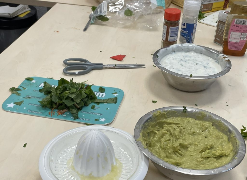 8. Lege das Gemüse bunt auf eine Platte und stelle den Dip in kleine Schälchen.
